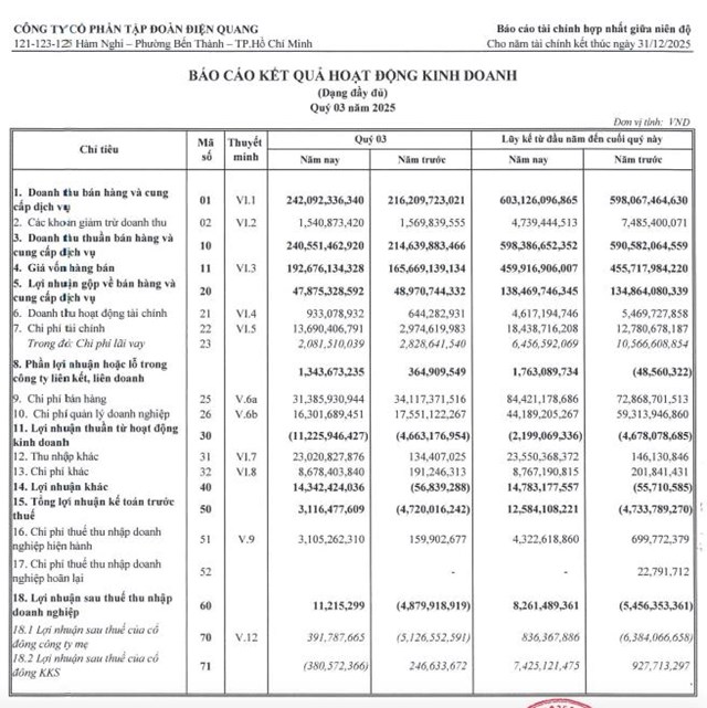 CTCP Tập đoàn Điện Quang (mã ck: DQC) vừa công bố báo cáo tài chính quý III/2025 và 9 tháng đầu năm.