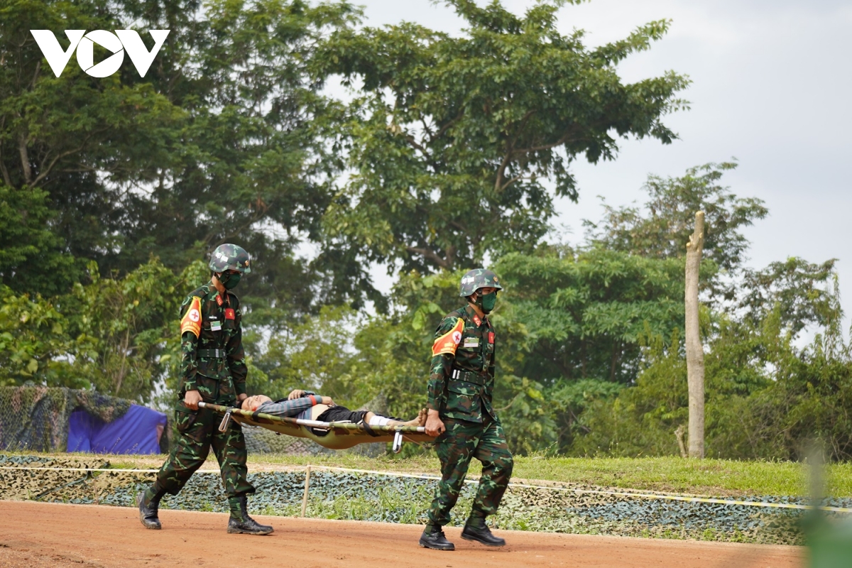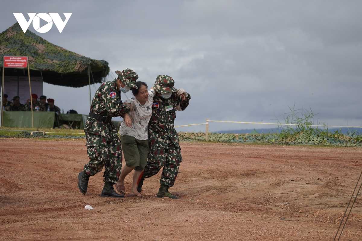 Đối với nội dung tìm kiếm, cứu hộ và giúp đỡ người gặp nạn do lũ lụt, lực lượng quân đội ba nước thực hành tuần tra, tìm kiếm người gặp nạn trong phạm vi khu vực lũ lụt theo các điểm bằng thuyền và máy bay không người lái; cứu nạn và giúp đỡ người gặp nạn còn mắc kẹt trong các ngôi nhà, trên cây và khu vực bị cô lập; cứu nạn và giúp đỡ người gặp nạn bị thương tích do nước cuốn trôi; tổ y tế khẩn cấp sơ cứu người bị nạn trước khi chuyển đến Bệnh viện dã chiến.
