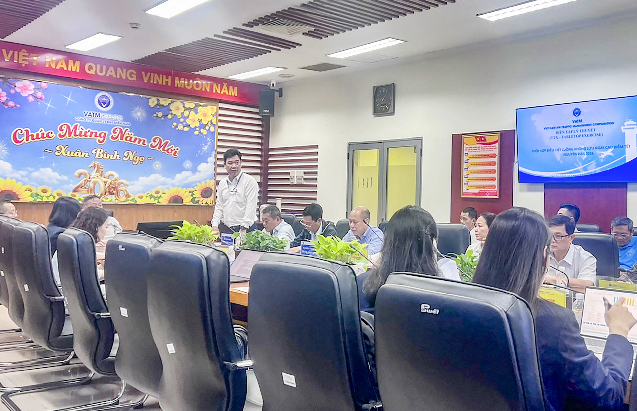 Trước yêu cầu bảo đảm an toàn, điều hòa và hiệu quả hoạt động bay trong bối cảnh này, Trung tâm Quản lý luồng không lưu vừa tổ chức buổi diễn tập lý thuyết với chủ đề "Phối hợp điều tiết luồng không lưu ngày cao điểm tết Nguyên đán 2026" nhằm kiểm tra tính sẵn sàng, khả năng phối hợp và năng lực ra quyết định của các đơn vị liên quan trong các tình huống bất thường.
