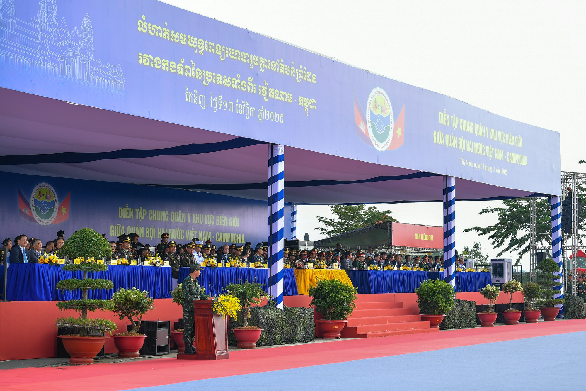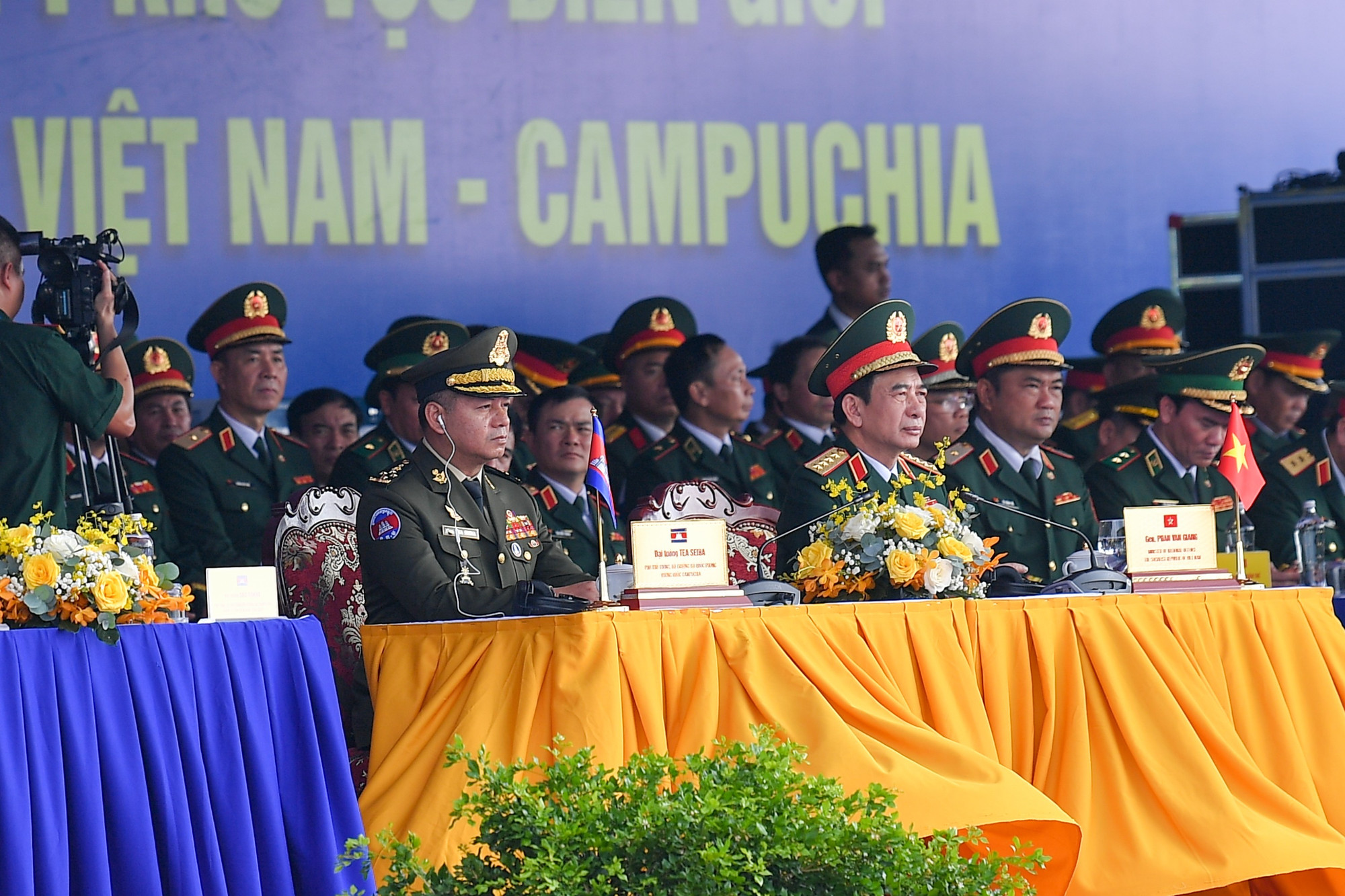 Đại tướng Phan Văn Giang, Ủy viên Bộ Chính trị, Phó Bí thư Quân ủy Trung ương, Bộ trưởng Quốc phòng; Đại tướng Tea Seiha, Phó Thủ tướng Chính phủ, Bộ trưởng Quốc phòng Campuchia chứng kiến buổi diễn tập.