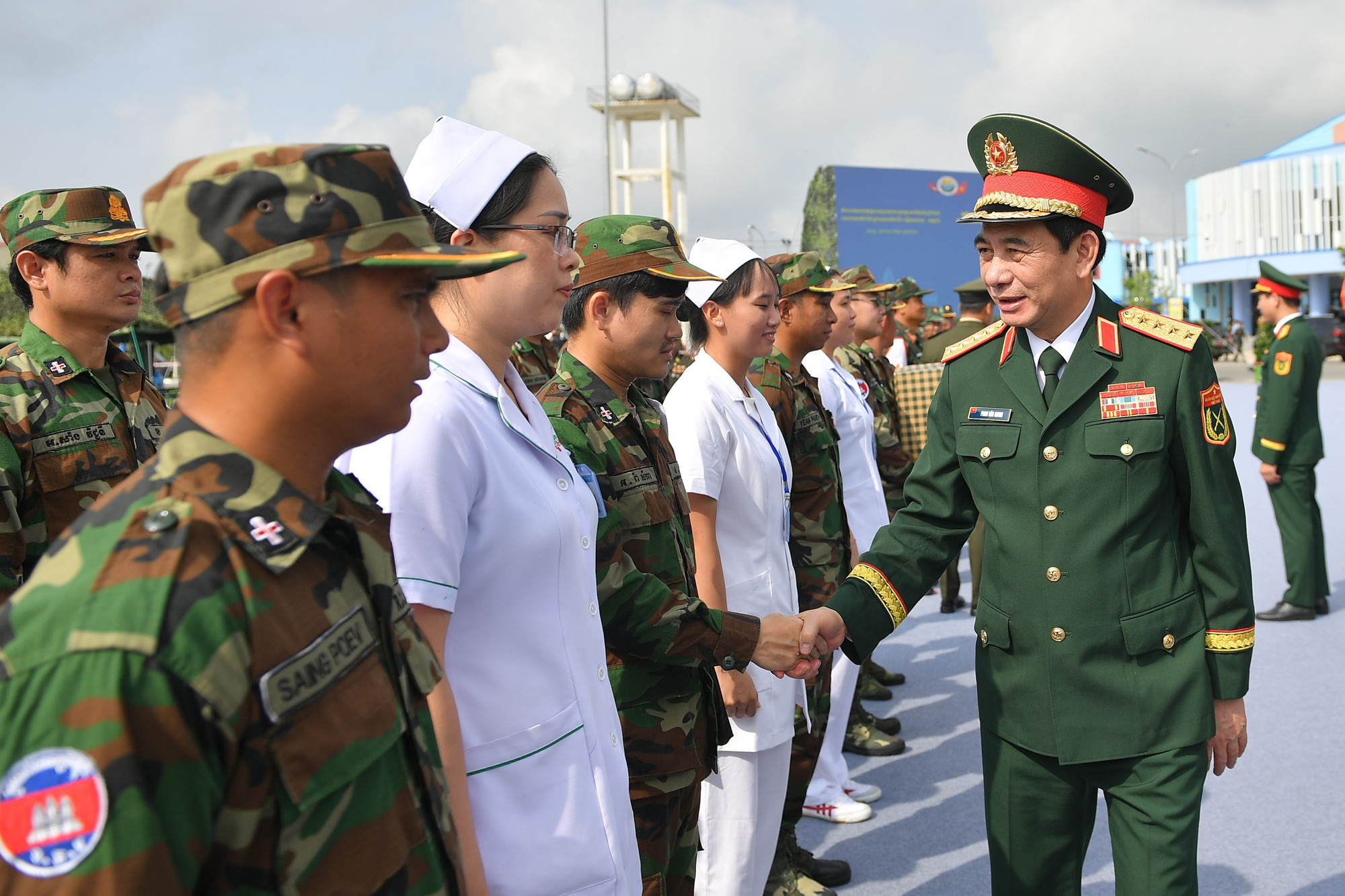 Đại tướng Phan Văn Giang, Ủy viên Bộ Chính trị, Phó Bí thư Quân ủy Trung ương, Bộ trưởng Quốc phòng cùng Đại tướng Tea Seiha, Phó Thủ tướng Chính phủ, Bộ trưởng Quốc phòng Campuchia tặng quà cho các lực lượng tham gia diễn tập.