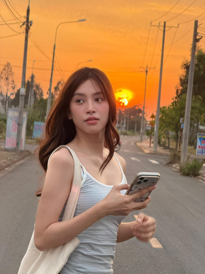 Điện thoại Tiểu Vy sử dụng là iPhone 17 Pro Max. Sản phẩm được thiết kế nhôm nguyên khối mới kết hợp kính cường lực Ceramic Shield 2 giúp máy trở nên sang trọng và bền bỉ hơn, đồng thời tối ưu khả năng chống trầy và giảm hư hỏng khi rơi vỡ. Với ba tùy chọn màu sắc gồm bạc, cam vũ trụ và xanh đậm, thiết bị mang phong cách hiện đại, phù hợp cả người dùng trẻ lẫn những ai yêu sự tinh tế.