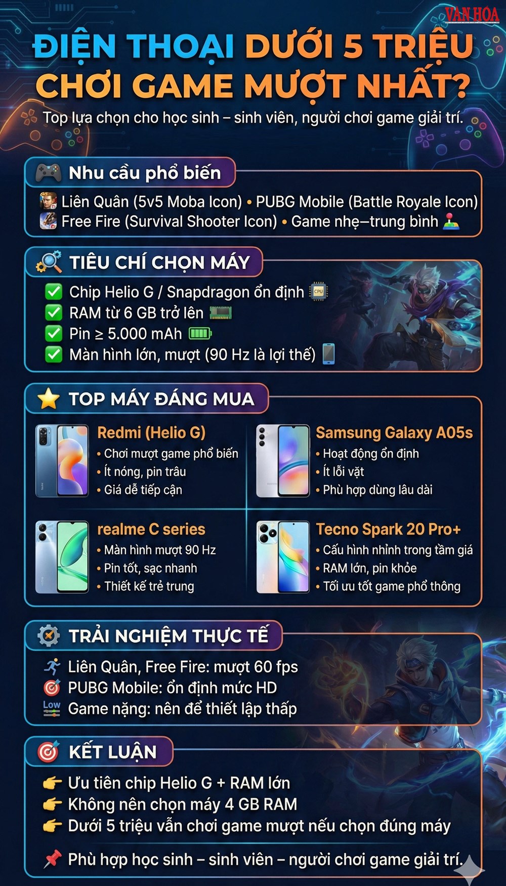 Trong phân khúc dưới 5 triệu đồng, người dùng ngày càng quan tâm đến khả năng chơi game mượt, ít giật lag và bền bỉ lâu dài. Không chỉ học sinh, sinh viên mà cả người đi làm cũng tìm kiếm smartphone giá rẻ nhưng vẫn đủ sức “chiến” các tựa game phổ biến như Liên Quân, PUBG Mobile, Free Fire hay Genshin Impact ở mức thiết lập phù hợp.