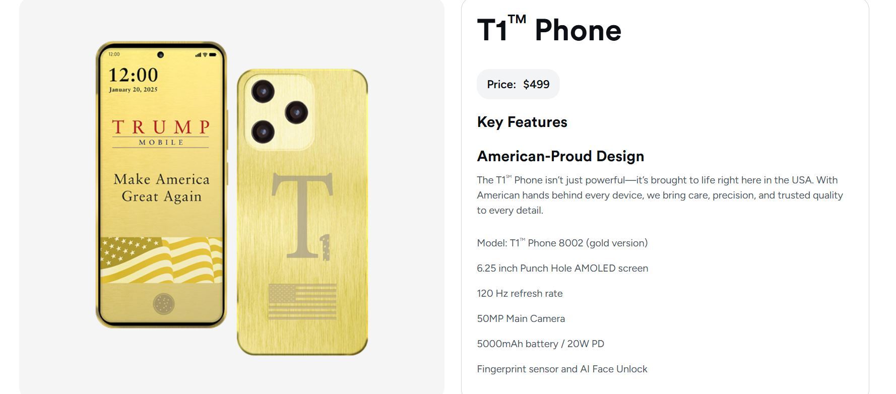 Chiếc điện thoại T1 ban đầu được công bố là sản xuất tại Mỹ và dự kiến ra mắt vào tháng 8/2025. Tuy nhiên, khi việc sản xuất smartphone quy mô lớn trong nước được cho là không khả thi, Trump Mobile đã rút lại tuyên bố "Made in the USA".