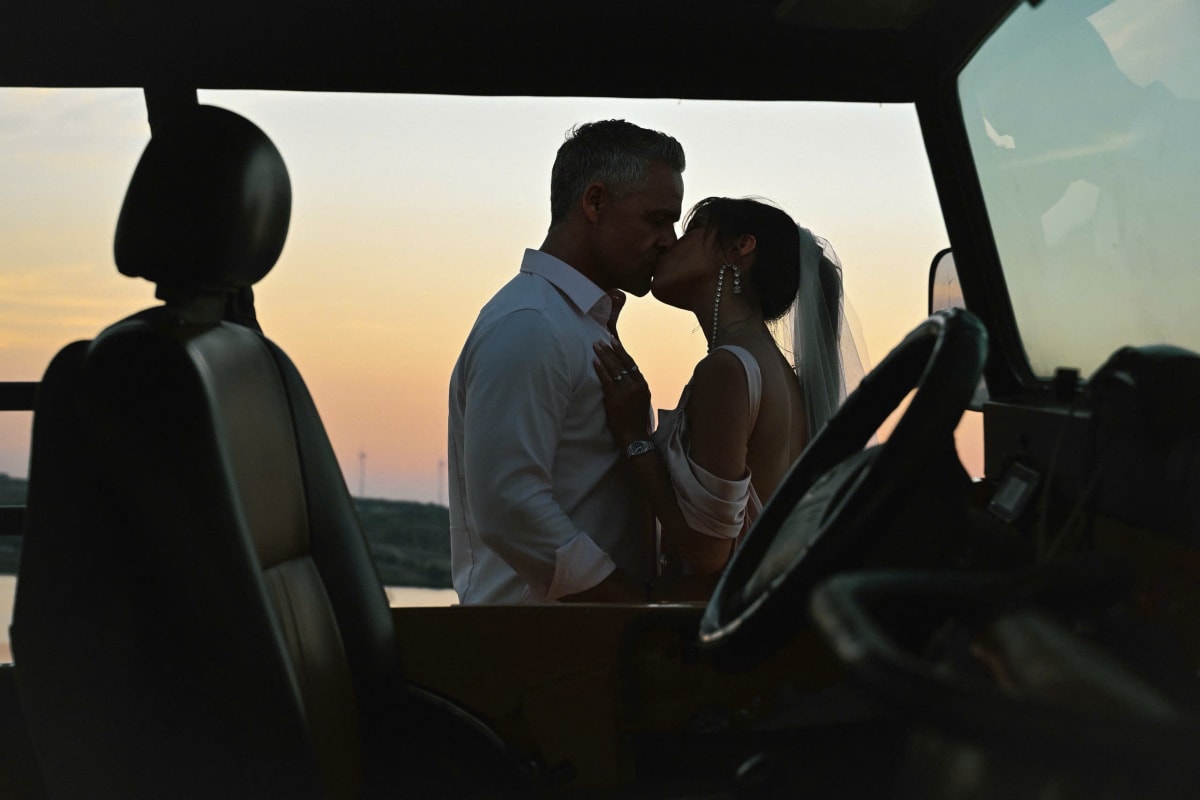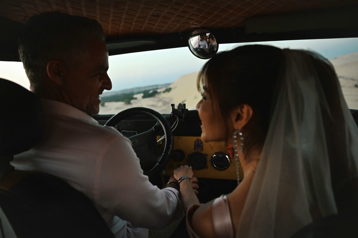 Cô nắm tay vị hôn phu khi đi dạo đồi cát bằng xe jeep.