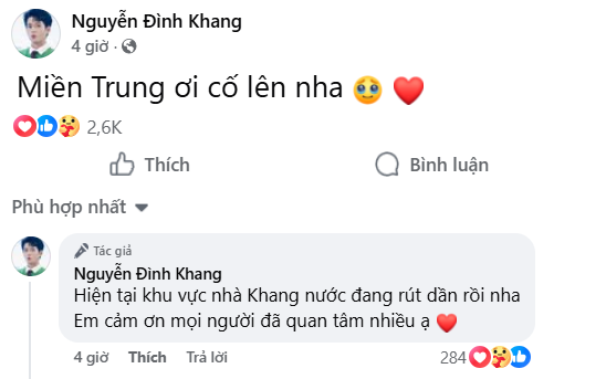 Sau những lời kêu gọi, Đình Khang đã cập nhật thông tin mới nhất cho biết gia đình anh đã nhận được sự hỗ trợ ban đầu. "Tình hình mưa vẫn liên tục không ngừng ạ... Ba mẹ em mới được cứu hộ đến để gửi áo phao rồi ạ cũng nhẹ nhõm được một ít. Dạ em cảm ơn mọi người nhiều lắm ạ", nam diễn viên chia sẻ. Hiện anh đang tìm chuyến bay sớm nhất để trở về quê. Dưới các bài đăng, nhiều nghệ sĩ cũng như khán giả đã để lại lời động viên, mong gia đình anh bình an.