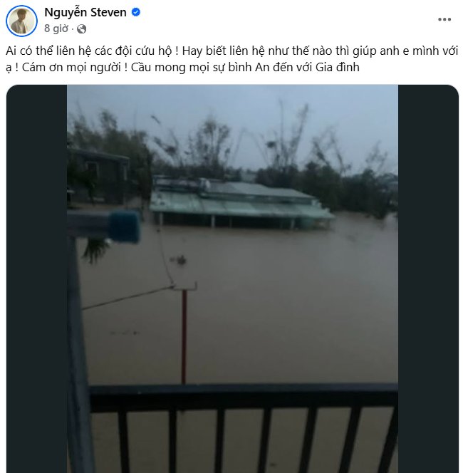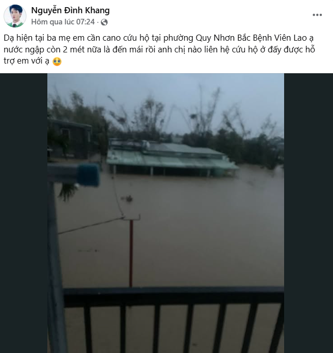 Đình Khang khiến nhiều người lo lắng khi liên tục cầu cứu, cho biết bố mẹ đang nằm trong vùng bị ngập lụt. Ảnh: FBNV.