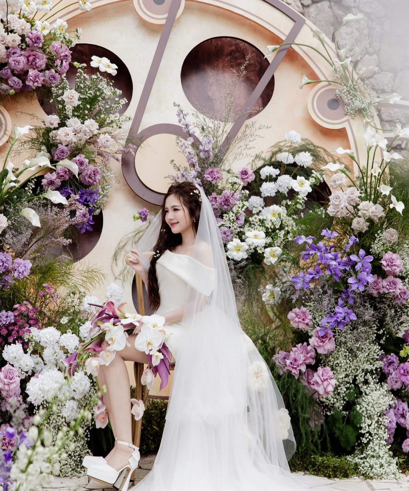Trước khi bắt đầu tiệc chiêu đãi, Đình Tú và Ngọc Huyền đã trao lời thề nguyện trong một buổi lễ thân mật với sự chứng kiến của gia đình và bạn bè thân thiết. Không gian buổi lễ được trang trí với tông màu tím và trắng chủ đạo, sử dụng hoàn toàn hoa tươi, tạo nên một bối cảnh lãng mạn và trang trọng.