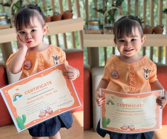 Tại trường mầm non quốc tế, bé Lita được đánh giá cao về khả năng quan sát và sự chủ động trong học tập. Theo nội dung bằng khen, nhóc tì gần 2 tuổi đã thể hiện rõ sự tò mò, tư duy sáng tạo và khả năng tự tin biểu đạt bản thân thông qua các hoạt động hội họa và trò chơi vận động. Kha Ly không giấu được sự xúc động khi chứng kiến con gái nhỏ dần trưởng thành và dạn dĩ trong môi trường giáo dục sớm.