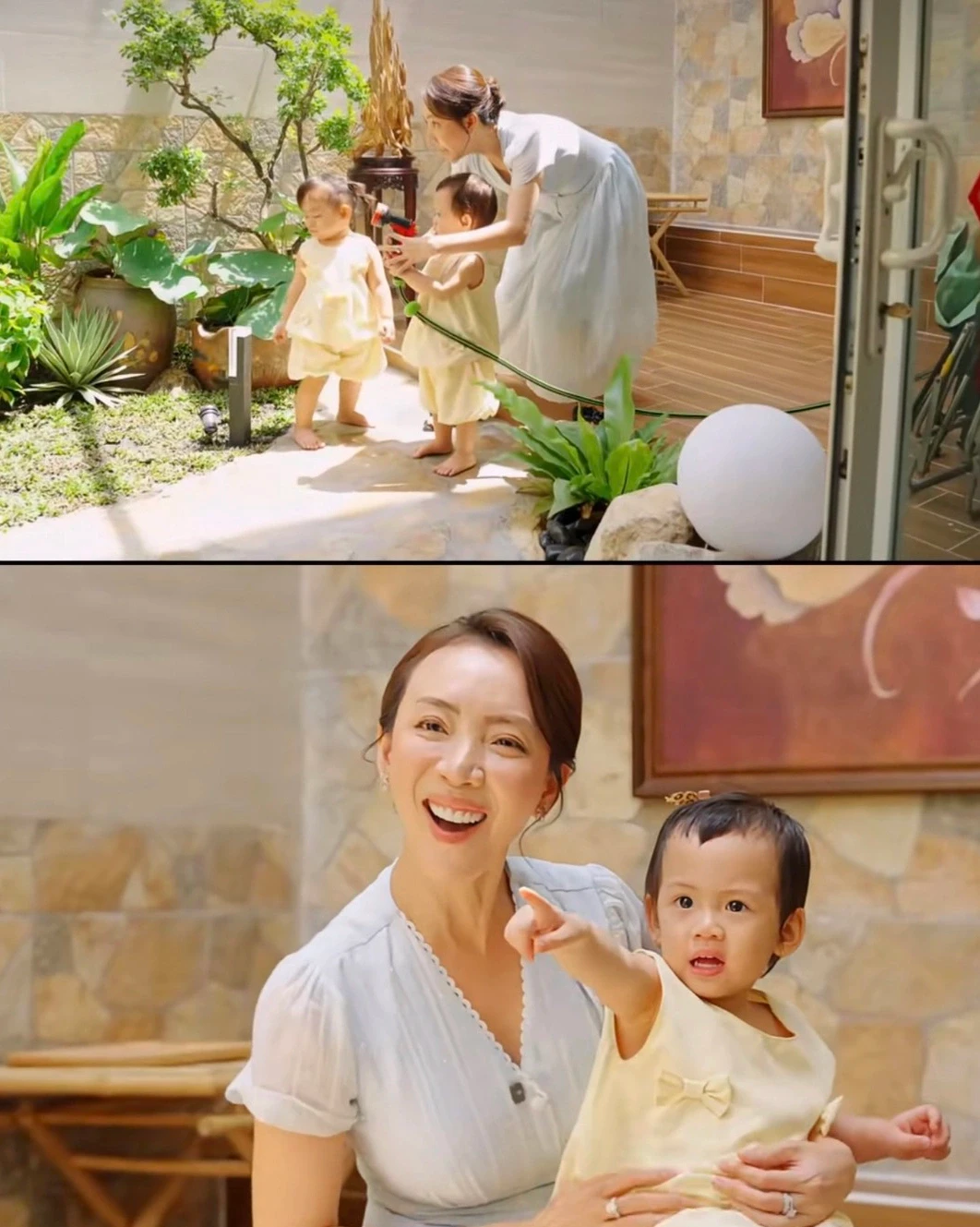 Con trai lớn của Thu Trang chăm 2 em rất chu đáo.