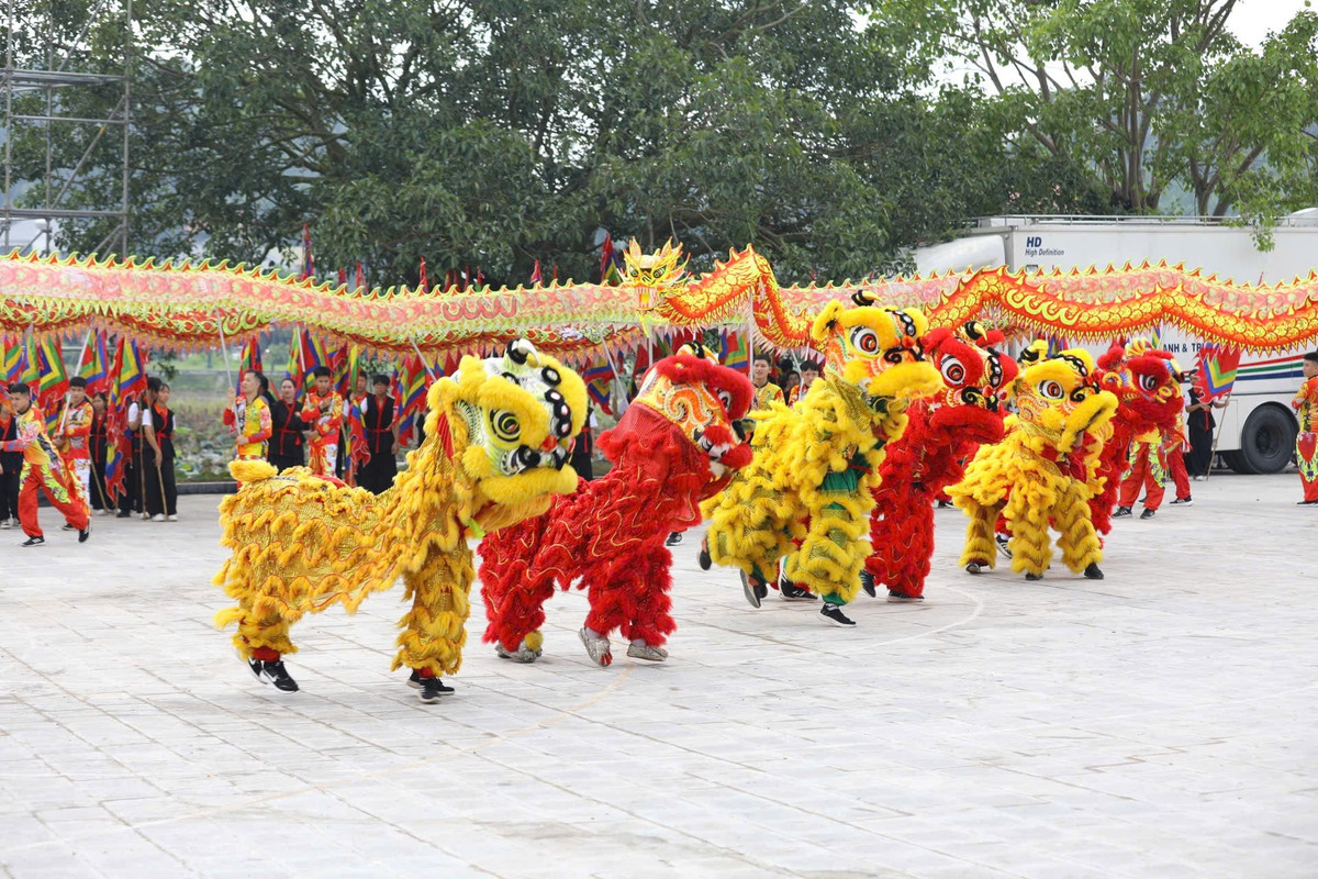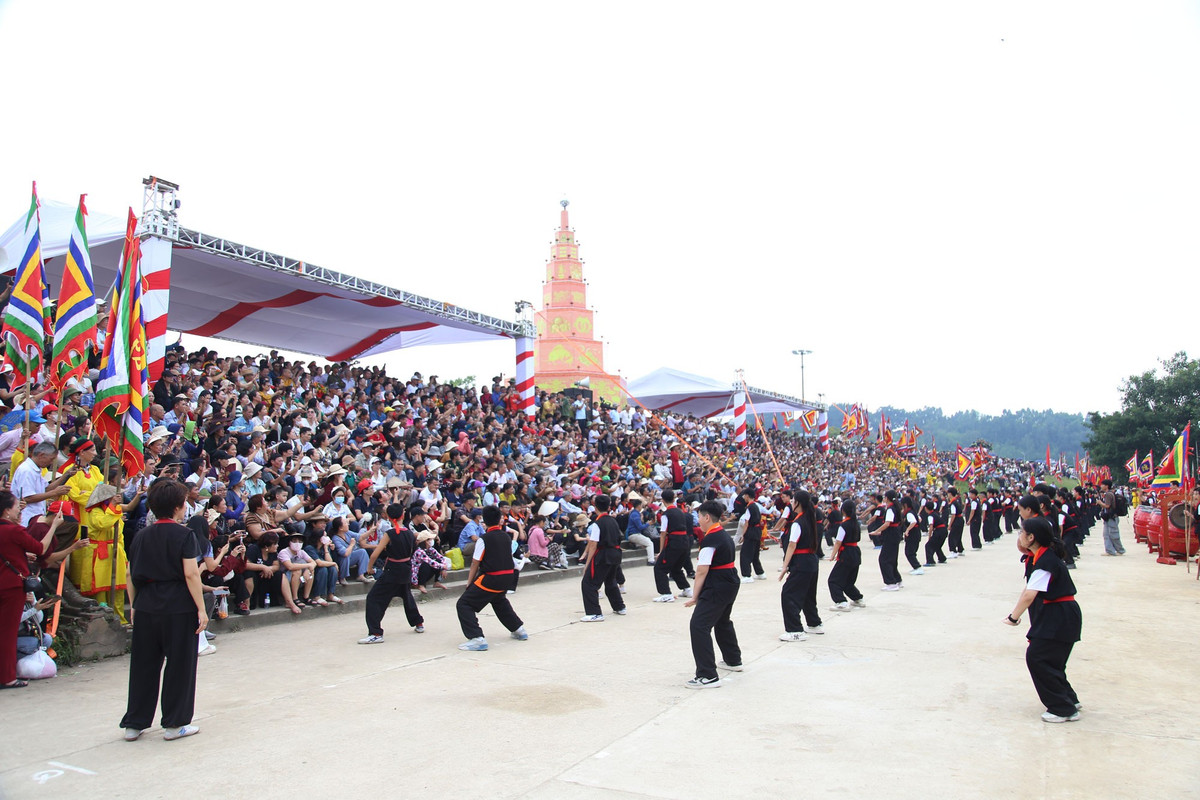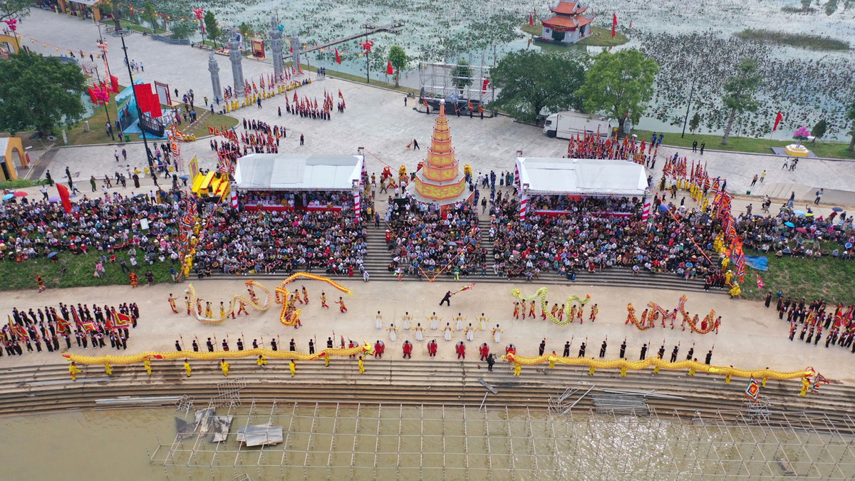 Suốt dải bờ sông, từ Nam Tào đến Bắc Đẩu, cờ phướn rợp trời. 400 võ sinh môn phái Võ Nhất Nam, 100 tiêu binh, các đội lân sư rồng, trống, chiêng, diễn viên không chuyên trong trang phục cổ truyền nhiều màu sắc.