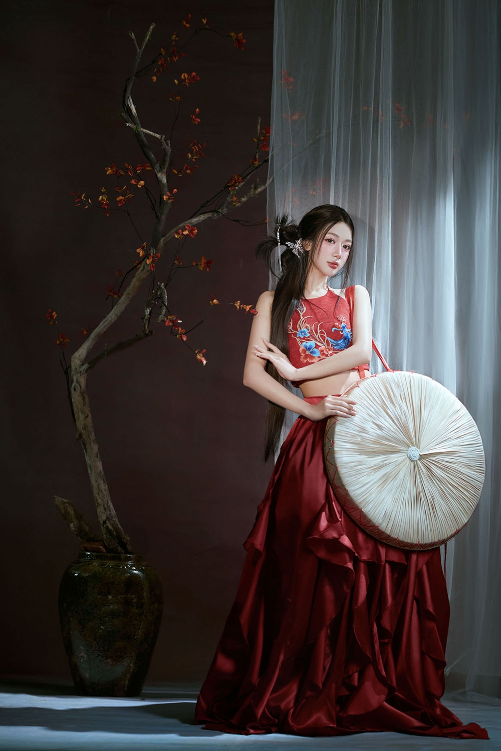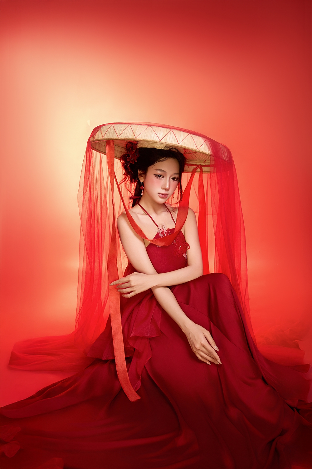 Trong thiết kế yếm màu trắng tinh khôi và hồng phấn, Thanh Hương hóa thân thành một “nàng thơ” mùa xuân với vẻ đẹp trong trẻo, ngọt ngào bên đóa sen hồng và chiếc nón lá mộc mạc. Còn khi khoác lên mình chiếc yếm đỏ rực rỡ - gam màu biểu tượng cho sự may mắn dịp Tết, Thanh Hương lập tức “lột xác” với thần thái sắc sảo, đầy quyến rũ, trưởng thành.