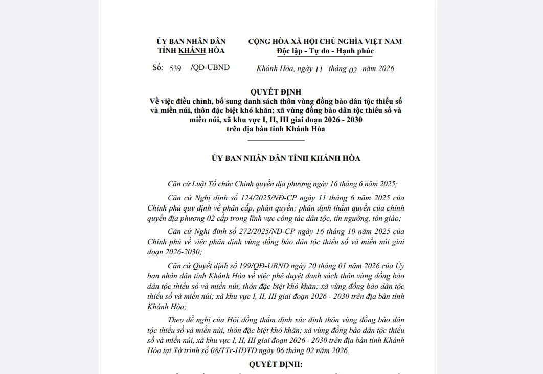 UBND tỉnh Khánh Hòa vừa ban hành Quyết định số 539 điều chỉnh, bổ sung danh sách thôn vùng đồng bào dân tộc thiểu số (ĐBDTTS) và miền núi, thôn đặc biệt khó khăn; xã vùng ĐBDTTS và miền núi; xã khu vực I, II, III giai đoạn 2026 - 2030 trên địa bàn tỉnh. Danh sách các thôn, xã theo quyết định này có hiệu lực áp dụng từ ngày 1-1-2026 và được sử dụng trong suốt giai đoạn 2026 - 2030.