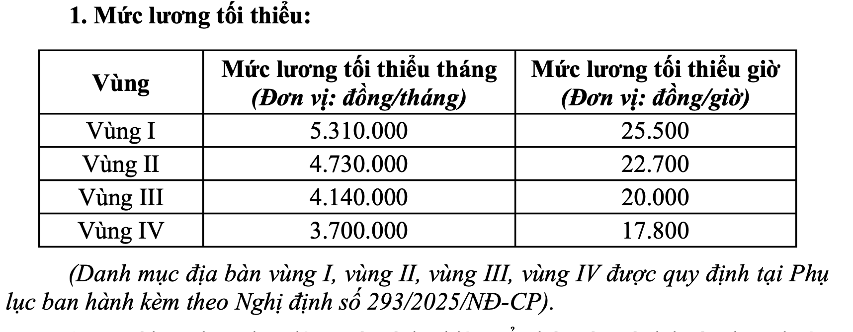 Vùng I, mức lương tối thiểu tháng là 5.310.000 đồng và mức lương tối thiểu là 25.500 đồng/giờ; Vùng II, mức lương tối thiểu tháng là 4.730.000 đồng và mức lương tối thiểu là 22.700 đồng/giờ; Vùng III, mức lương tối thiểu tháng là 4.140.000 đồng và 20.000/giờ; Vùng IV, mức lương tối thiểu tháng là 3.700.000 đồng và 17.800/giờ.