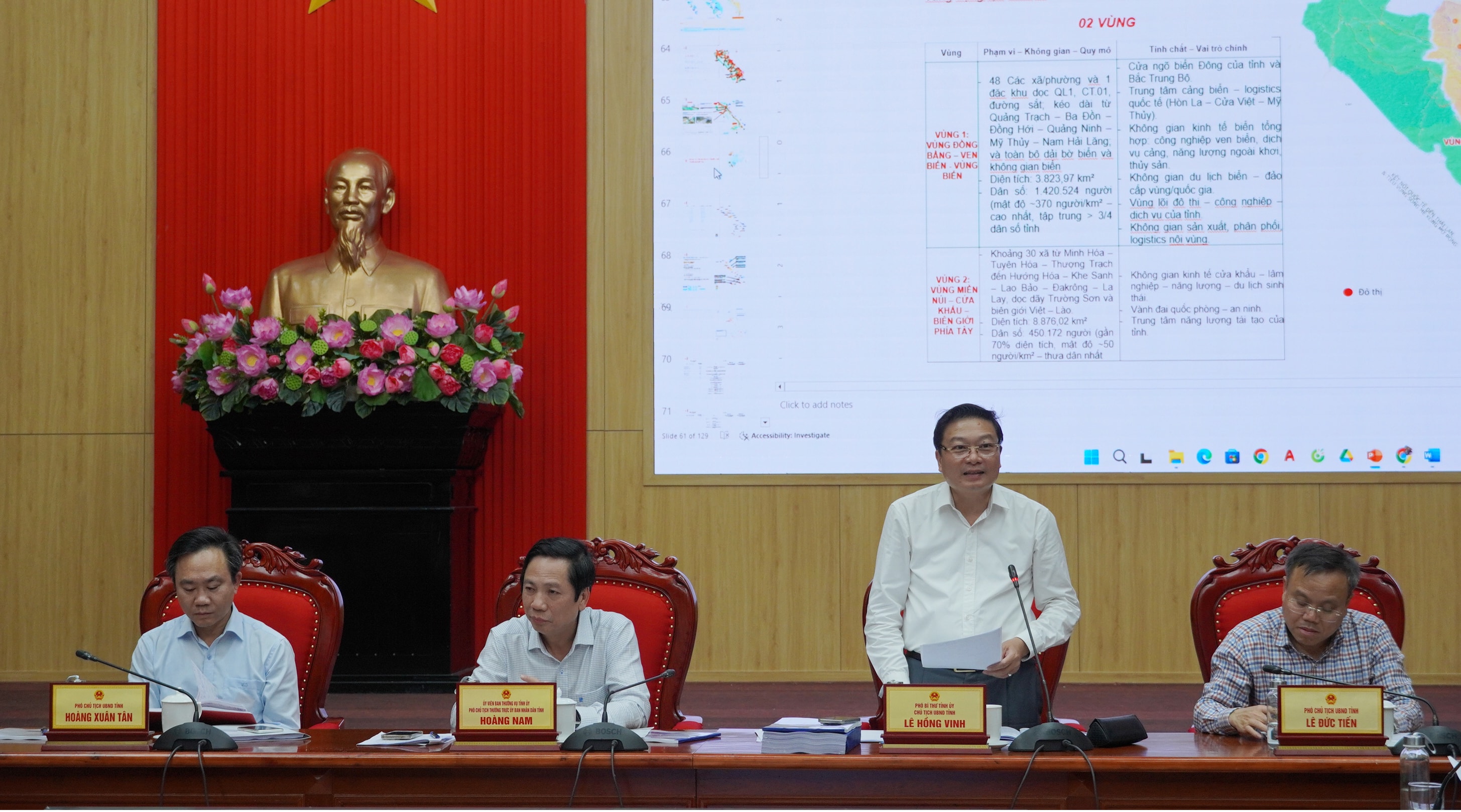 Chủ tịch UBND tỉnh Lê Hồng Vinh cũng yêu cầu Ban Chỉ đạo lập điều chỉnh quy hoạch tỉnh, các sở, ngành, đơn vị liên quan cần rà soát lại các nội dung trong điều chỉnh quy hoạch tỉnh, bảo đảm phù hợp với quy hoạch của Quốc gia và các quy hoạch ngành đã có. Địa phương cũng cần nhìn nhận rõ các thuận lợi cũng như các hạn chế để tích hợp vào quy hoạch nhằm thuận lợi hơn trong quá trình thực hiện, tránh chồng chéo và tránh phải điều chỉnh quy hoạch nhiều lần. Bên cạnh đó, nghiên cứu một số phương án lấn biển ở khu vực phía Bắc của tỉnh để mở rộng không gian phát triển đô thị; góp phần phát huy tối đa tiềm năng, lợi thế của tỉnh.