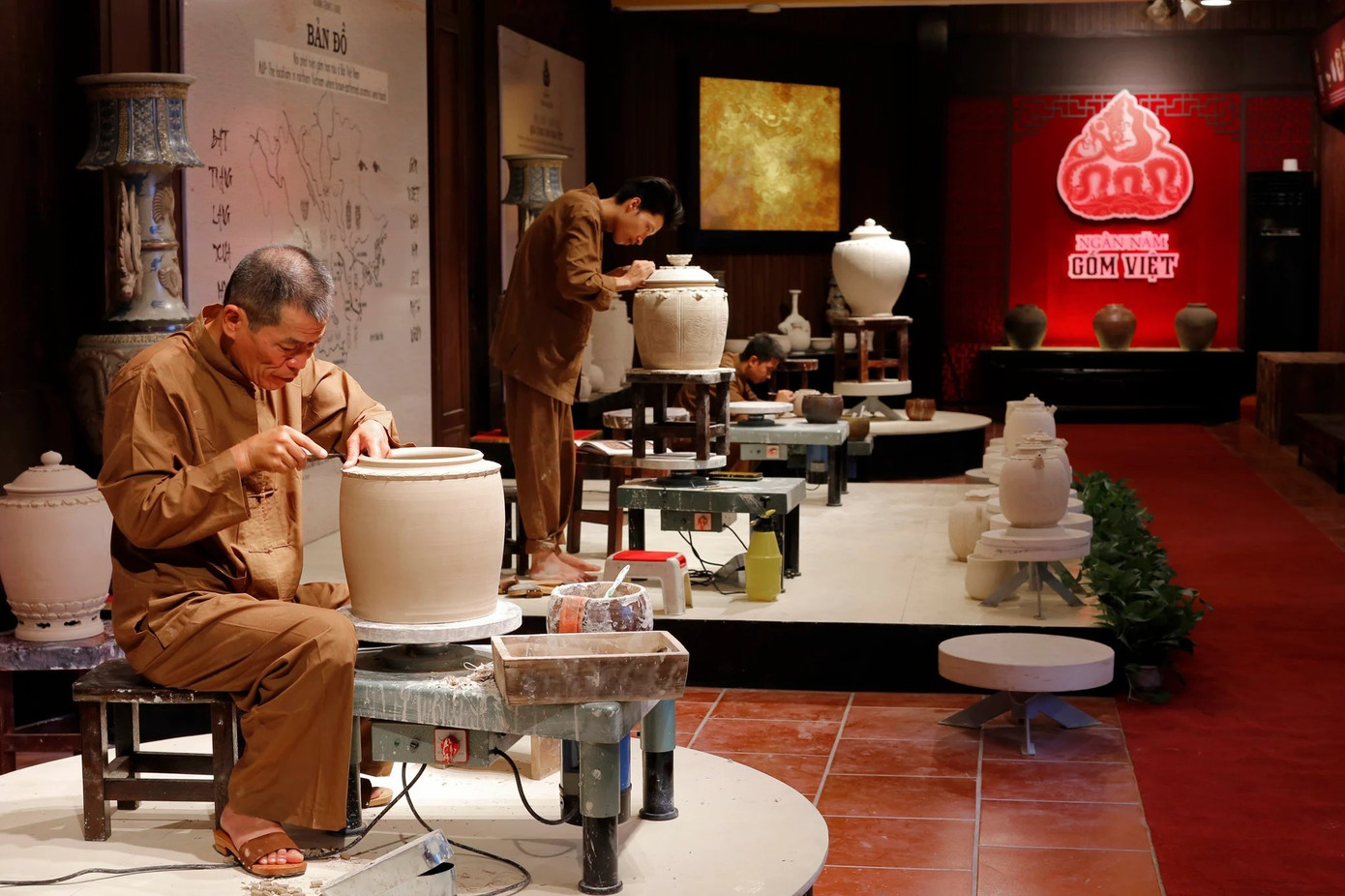 Nghệ nhân Bát Tràng tạo hình gốm trên bàn xoay, một công đoạn đòi hỏi sự ổn định của đôi tay và cảm nhận chính xác về độ ẩm của đất.