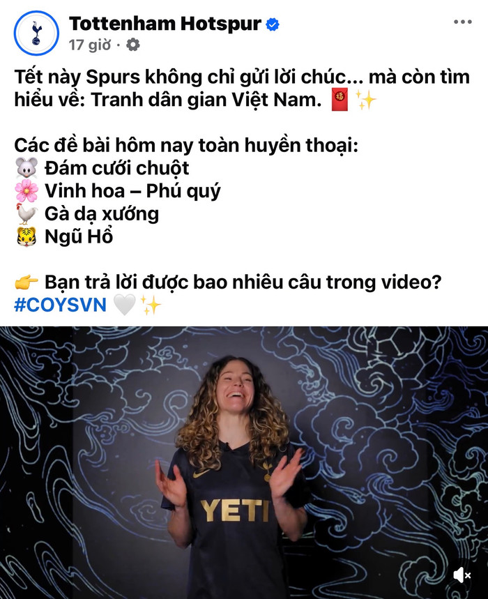 Trước đó, Tottenham Hotspur cũng từng đăng nội dung chúc Tết dành riêng cho khán giả Việt Nam. Đáng chú ý, CLB này còn chia sẻ đoạn clip các cầu thủ đoán tranh dân gian “Đám Cưới Chuột”. Nội dung này cũng không hiển thị rộng rãi toàn cầu mà được tùy chỉnh để tiếp cận người dùng Việt Nam.