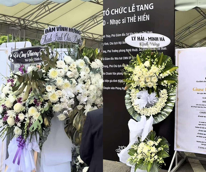 Nhiều nghệ sĩ Việt gửi vòng hoa đến viếng tang lễ nhạc sĩ Thế Hiển. (Ảnh từ TikTok Tâm Xì Phố)