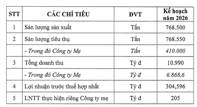 Năm 2026, Phân bón Bình Điền đặt kế hoạch tổng doanh thu 10.990 tỉ đồng, lợi nhuận trước thuế hợp nhất gần 305 tỉ đồng, giảm hơn 38% so với thực hiện năm 2025.