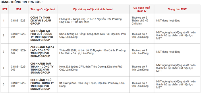 Nhiều chi nhánh Công ty TNHH Dịch vụ Sugar Group đã dừng hoạt động (Nguồn: Thuế Việt Nam).