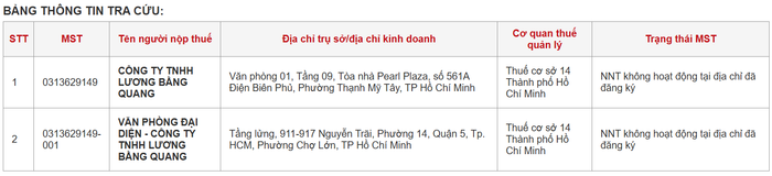 Công ty TNHH Lương Bằng Quang hiện không hoạt động tại địa chỉ đăng ký. (Nguồn: Thuế Việt Nam)