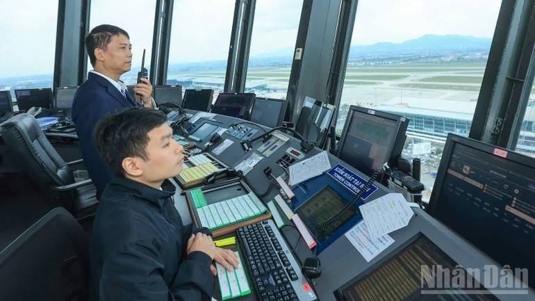 Kiểm soát viên không lưu làm việc trên Đài chỉ huy Nội Bài.