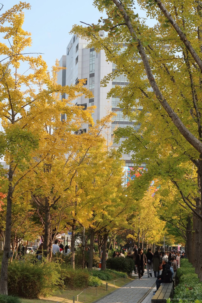Khung cảnh mùa thu ở Hàn Quốc lãng mạn với hàng cây đổi màu lá. (Ảnh Phượt Korea)