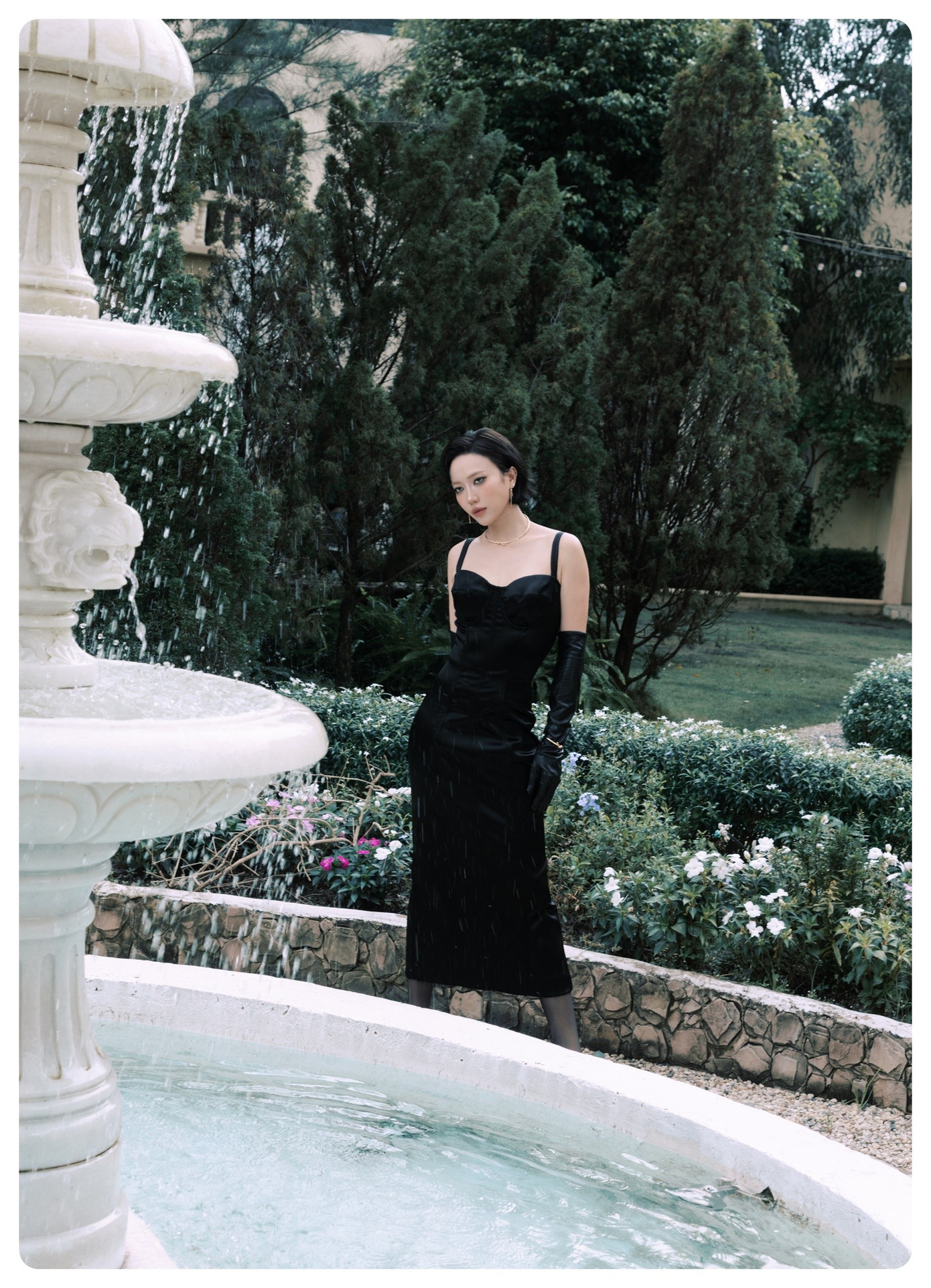 Outfit đầu tiên cô chọn mẫu đầm đen ôm dáng cổ điển kết hợp bao tay da. Thiết kế thứ 2 là váy chữ A, giày cao gót đen bít mũi. Bộ cánh cuối sử dụng coach jacket da tông nâu được phối phong cách nobra.