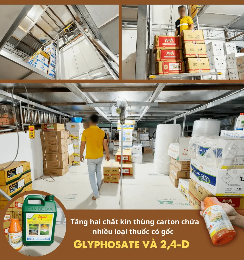 Tầng hai cũng chất kín thùng carton chứa nhiều loại thuốc có gốc Glyphosate và 2,4-D – những hoạt chất đã bị cấm sử dụng tại Việt Nam từ năm 2021.