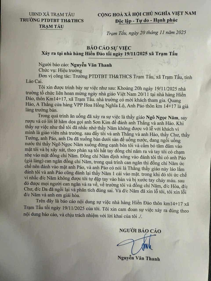 Theo nội dung biên bản báo cáo sự việc của hiệu trưởng Nguyễn Văn Thanh: Khoảng 20h ngày 19/11/2025, nhà trường tổ chức liên hoan mừng ngày nhà giáo Việt Nam 20/11 tại nhà hàng thuộc địa bàn xã Trạm Tấu, tỉnh Lào Cai. Trong buổi tiệc nhà trường có mời khách tham gia gồm: Quang Hào, A Thắng cửa hàng VPP Hoa Hồng Nghĩa Lộ, Giàng A Páo là già làng trưởng bản.