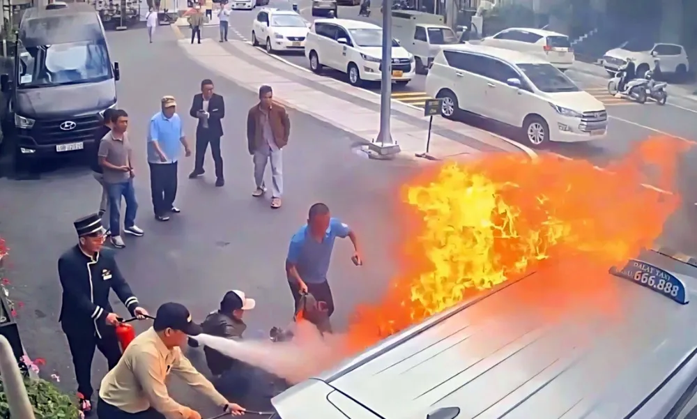 Bảo vệ khách sạn và nhiều người dân đã dùng bình chữa cháy khống chế ngọn lửa, mở cửa cứu người tài xế kẹt trong xe. Tài xế taxi được xác định là ông NT bị bỏng nặng phần chân hiện đã được chuyển đến TP.HCM cấp cứu.