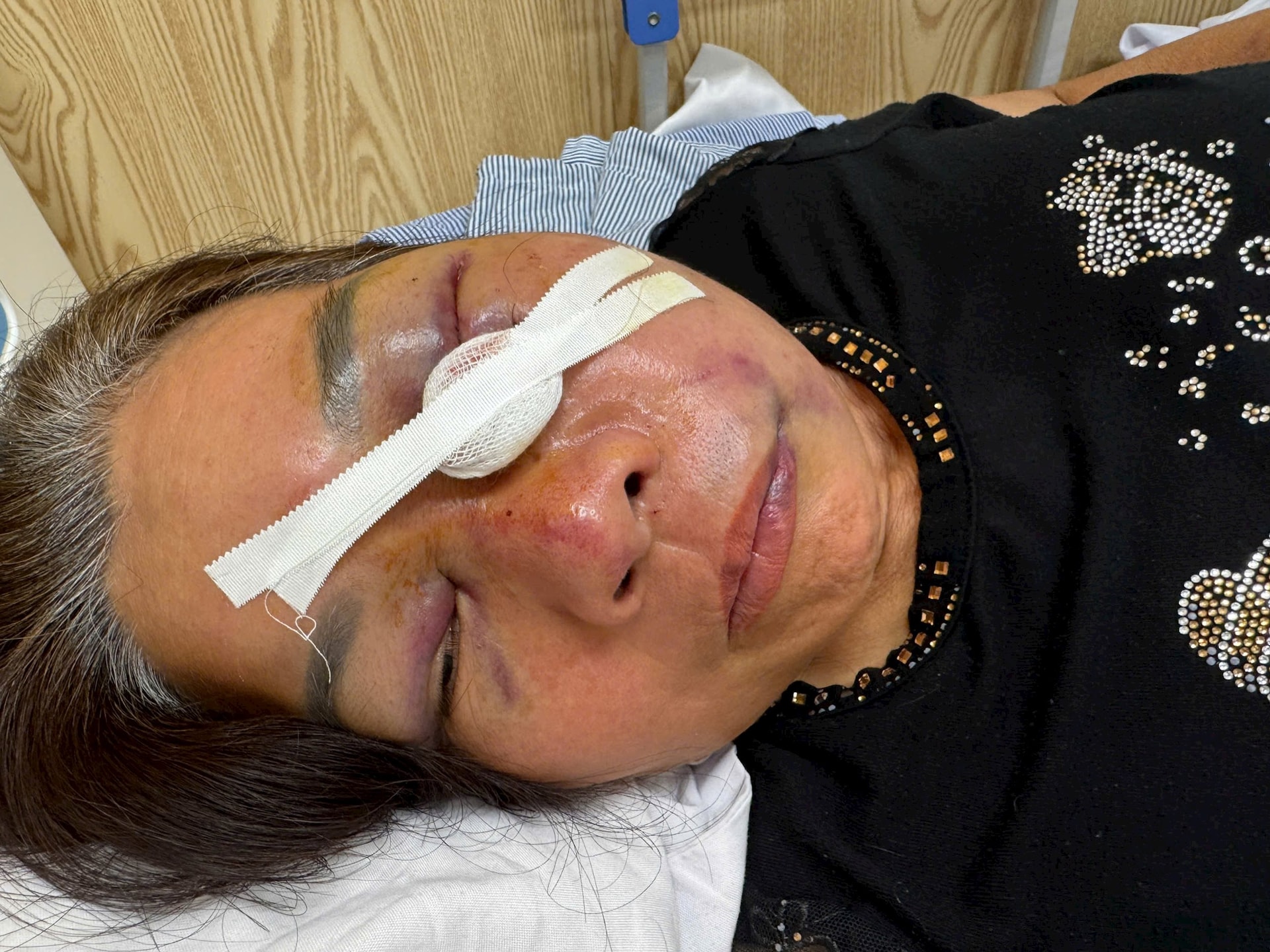 Hậu quả ban đầu, bà Thêm bị đa chấn thương, vùng mặt sưng phù nề, chấn thương não, hai bên mắt bị thâm tím tổn thương nghiêm trọng.