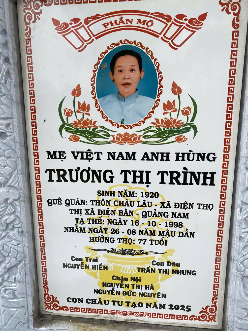 Được biết, trước đó, vào tháng 3.2026, ông Nguyễn Hiền (SN 1956, trú tại phường Sơn Trà, Đà Nẵng) đã có đơn trình báo cơ quan chức năng về việc mộ của mẹ mình là Mẹ Việt Nam Anh hùng Trương Thị Trình (tại nghĩa trang Nỗng Ông Thới, thuộc địa bàn phường Điện Bàn Bắc, Đà Nẵng) bị kẻ xấu đập phá. Ngôi mộ này mới được gia đình nâng cấp, cải tạo lại cuối tháng 6.2025 với kinh phí 40 triệu đồng.
