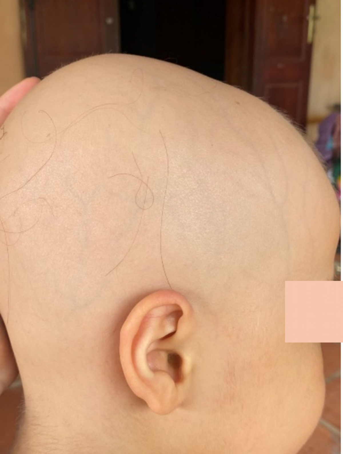 Bệnh nhi đến khám ban đầu trong tình trạng rụng trọc toàn thể da đầu - Ảnh BVCC