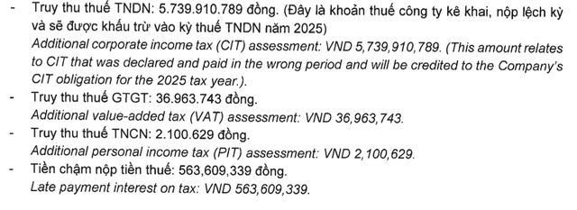 Đáng chú ý nhất là khoản truy thu thuế thu nhập doanh nghiệp lên đến 5,7 tỷ đồng. Đây là số thuế mà công ty được xác định là đã kê khai đúng nhưng nộp lệch kỳ, vì vậy cơ quan thuế yêu cầu nộp lại đúng kỳ; doanh nghiệp cho biết khoản này sẽ được khấu trừ vào kỳ thuế năm 2025.