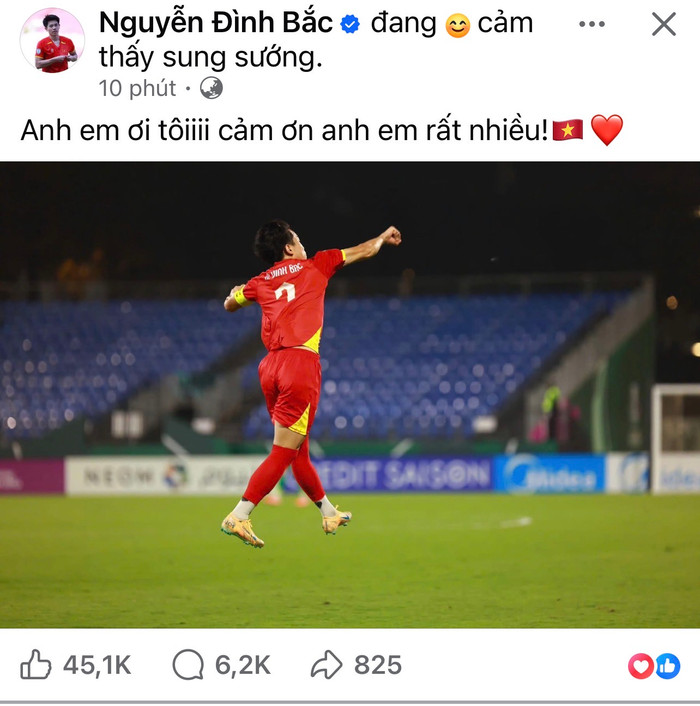 Cầu thủ sinh năm 2024 viết ngắn gọn: “Anh em ơi, tôi cảm ơn anh em rất nhiều!”, một lời chia sẻ ngắn gọn nhưng đủ cho thấy tâm trạng của anh sau một trận đấu đặc biệt.