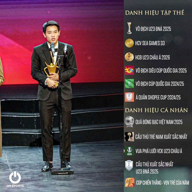 Danh hiệu Vua phá lưới VCK U23 châu Á và là Cầu thủ xuất sắc nhất giải U23 Đông Nam Á 2025 cũng thuộc về Đình Bắc. Tại Gala Cúp Chiến Thắng 2025 vừa qua, cái tên Nguyễn Đình Bắc một lần nữa trở thành tâm điểm của giới truyền thông khi được xướng tên ở hạng mục "Vận động viên trẻ của năm". Đây không chỉ là một giải thưởng cá nhân đơn thuần, mà còn là lời khẳng định đanh thép cho vị thế của tài năng trẻ sáng giá nhất bóng đá Việt Nam hiện nay.