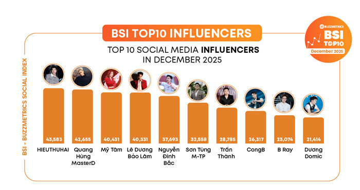 Đình Bắc vượt mặt cả Sơn Tùng M-TP và Trấn Thành trong bảng xếp hạng top 10 người có sức ảnh hưởng tháng 12. (Ảnh: BuzzMetrics)