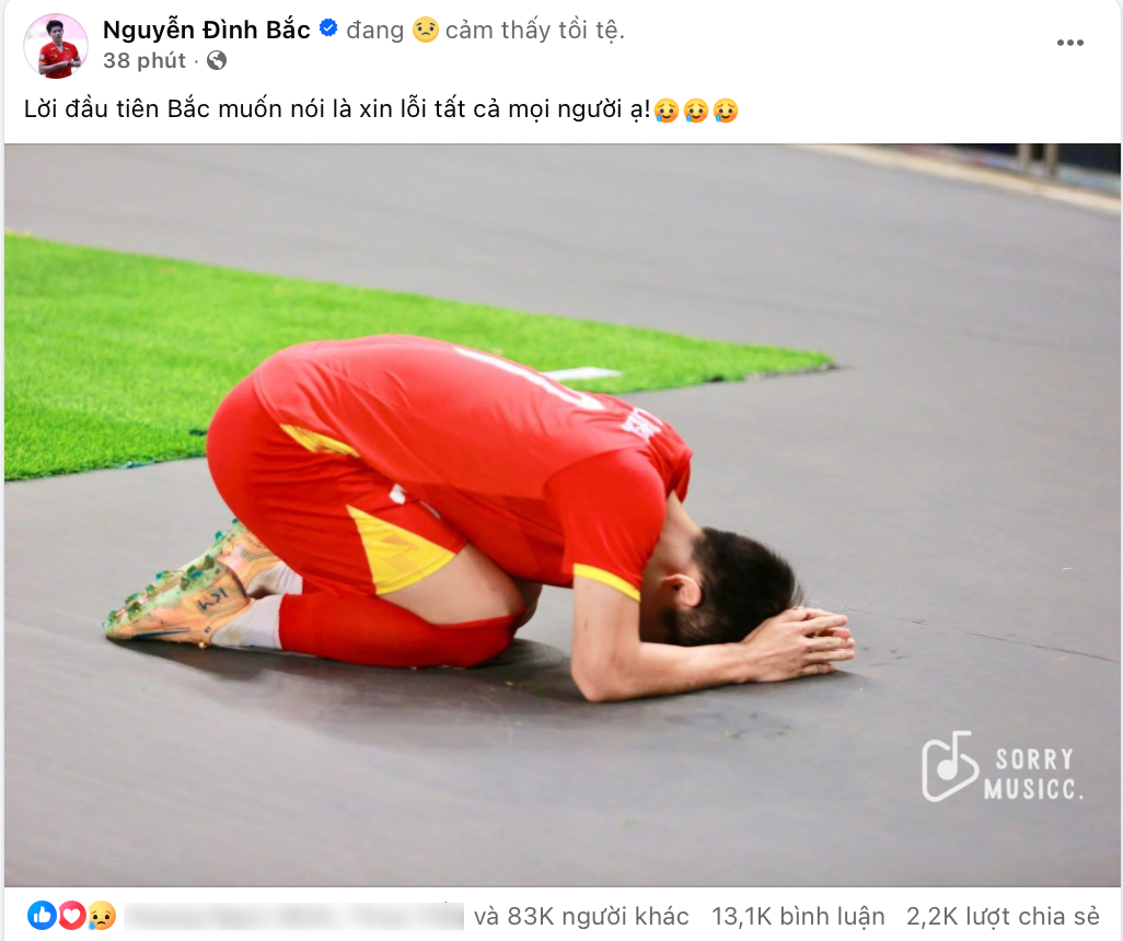 “Lời đầu tiên Bắc muốn nói là xin lỗi tất cả mọi người ạ!”, Đình Bắc viết, kèm theo biểu tượng cảm xúc buồn và hình ảnh anh cúi gập người, áp trán xuống mặt sân sau khi trận đấu khép lại. Khoảnh khắc này được chia sẻ rộng rãi trên mạng xã hội, trở thành hình ảnh tiêu biểu cho nỗi thất vọng và sự day dứt của các cầu thủ U23 Việt Nam sau khi dừng bước trước ngưỡng cửa Chung kết.
