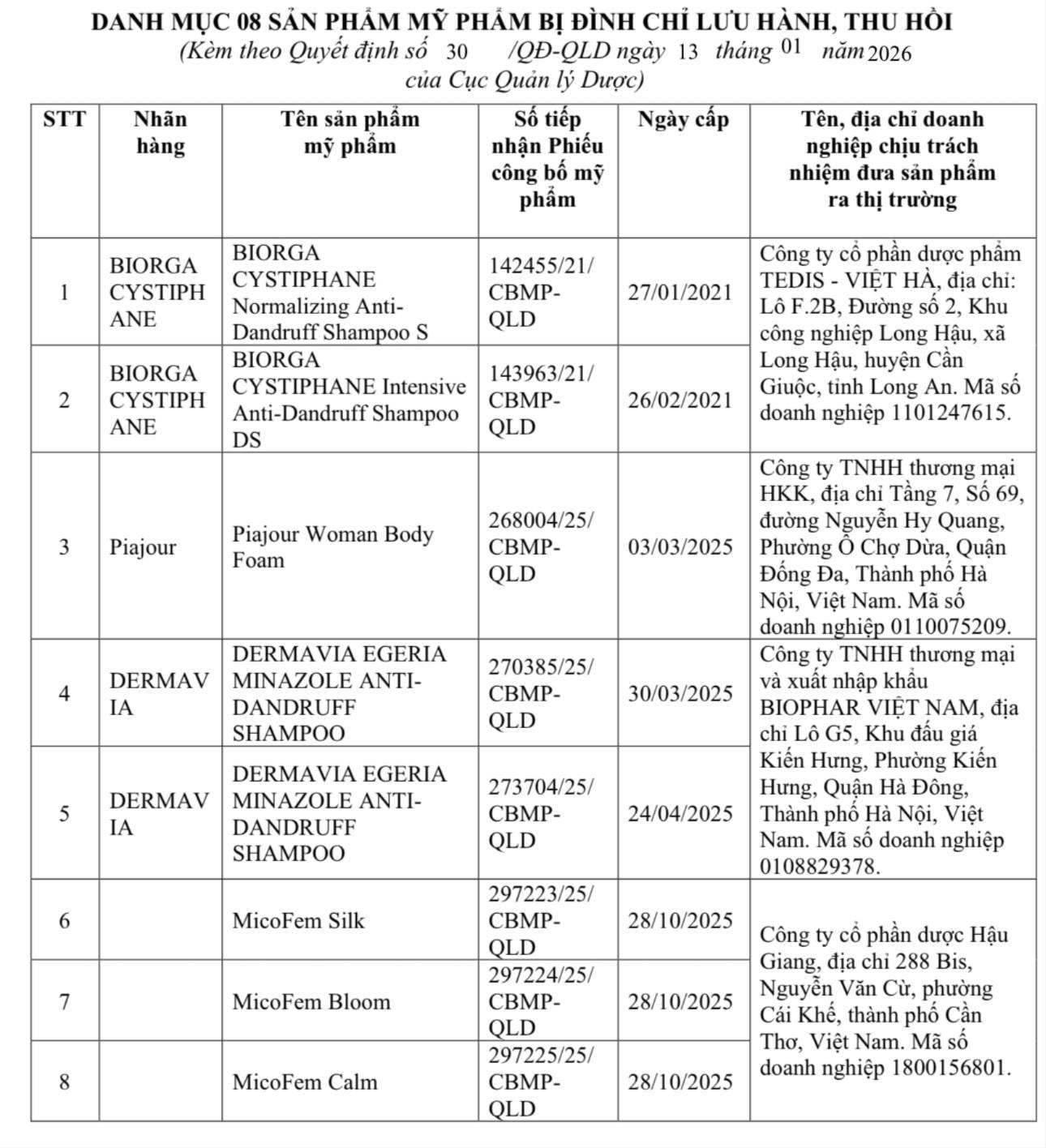 Phó Cục trưởng Cục Quản lý Dược Tạ Mạnh Hùng đã ký ban hành Quyết định số 30/QĐ-QLD về việc đình chỉ lưu hành, thu hồi các sản phẩm mỹ phẩm không đạt yêu cầu an toàn. Quyết định được đưa ra trên cơ sở kết quả Hội đồng mỹ phẩm ASEAN lần thứ 42 (tháng 11-2025, tại Indonesia), trong đó Hội đồng Khoa học mỹ phẩm ASEAN thống nhất loại bỏ Miconazole và Miconazole nitrate khỏi thành phần mỹ phẩm lưu hành trong khu vực.