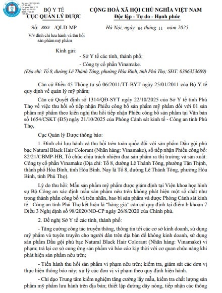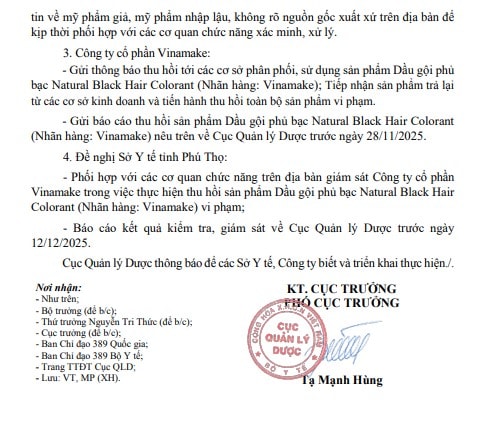 Cục Quản lý Dược (Bộ Y tế) yêu cầu, Sở Y tế tỉnh Phú Thọ phối hợp với các cơ quan chức năng trên địa bàn giám sát Công ty cổ phần Vinamake trong việc thực hiện thu hồi sản phẩm trên. Báo cáo kết quả kiểm tra, giám sát về Cục Quản lý Dược trước ngày 12/12.
