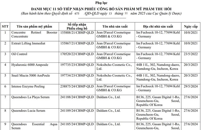 Theo Cục Quản lý Dược, các sản phẩm bị đình chỉ và thu hồi vì không có hoặc không xuất trình Hồ sơ thông tin sản phẩm (PIF) theo quy định khi cơ quan chức năng kiểm tra. Các sản phẩm bị thu hồi gồm: Queendoes Essential PDRN Serum, The Skin House Essential Wrinkle Collagen Toner, Black Pearl Peptide Patch, Snail Mucin 5000 Ampoule, Queendoes La Playa Serum, DR.IASO Triple-M Hydrating Cream, Dr.IASO Cica-Maca Cream, AHCare30%…