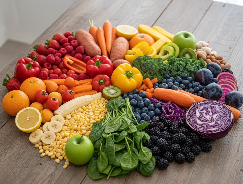 - Nhóm thực phẩm giàu chất chống oxy hóa: Nên chọn thực phẩm đa dạng màu sắc, hay còn gọi là dinh dưỡng màu sắc cầu vồng. Mỗi màu sắc của rau củ trái cây đại diện cho một loại dưỡng chất khác nhau. Màu đỏ của cà chua chứa lycopene giúp chống nắng tự nhiên cho da. Màu xanh đậm của rau bó xôi chứa chất diệp lục và sắt giúp máu lưu thông tốt, mang lại vẻ hồng hào. Màu cam của cà rốt và khoai lang giàu beta-carotene giúp tái tạo tế bào da... Việc đưa các loại thực phẩm đa dạng màu sắc vào thực đơn hàng ngày chính là cách nhanh nhất để nạp đầy các dưỡng chất này.