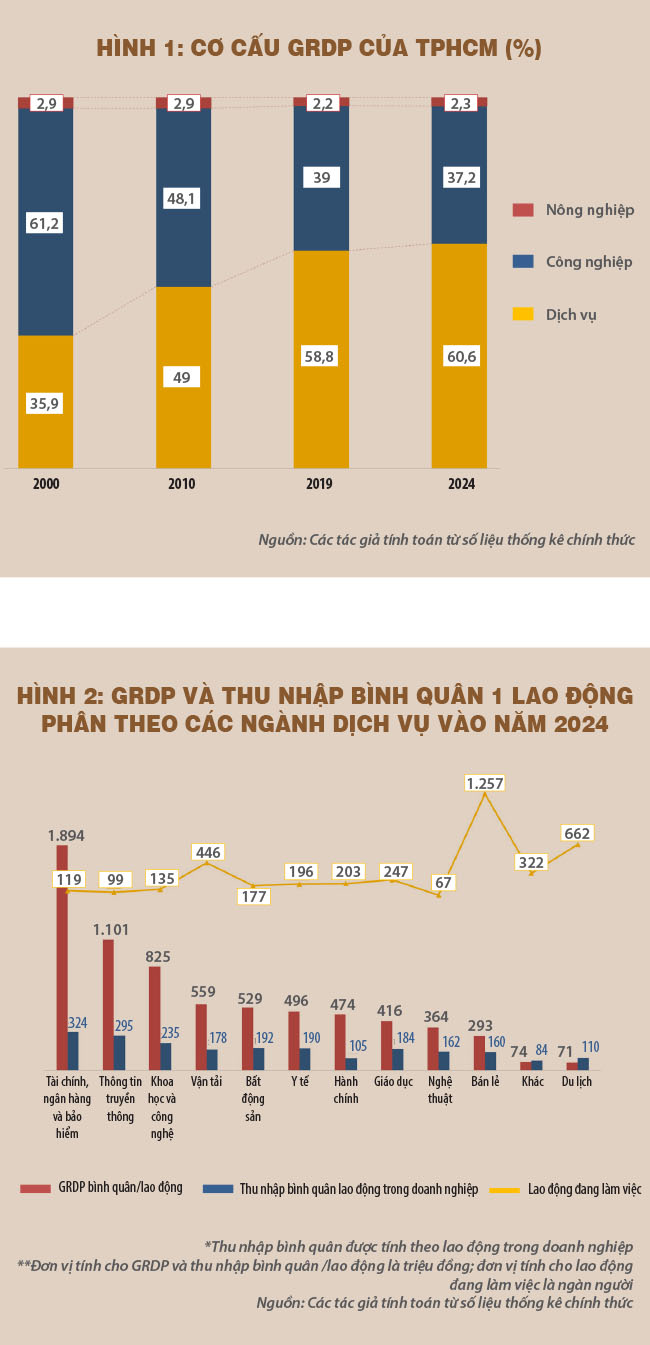 Ba ngành gồm công nghiệp chế biến, chế tạo, bán buôn và bán lẻ, và du lịch chiếm đến 61,1% tổng số lao động của TPHCM, nhưng năng suất lao động và thu nhập khá khiêm tốn. Trái lại, các ngành có năng suất lao động cao và thành phố đặt làm trọng tâm gồm: tài chính, giáo dục, y tế và khoa học công nghệ lại chỉ có quy mô nhỏ. Kết quả này phản ánh thực chất nền kinh tế và cấu trúc đô thị của TPHCM nói riêng và Việt Nam nói chung. Cho dù đã có sự chuyển dịch mạnh mẽ về cơ cấu kinh tế tổng thể, nhưng công nghiệp chủ yếu là gia công với giá trị gia tăng thấp và dịch vụ chủ yếu là quy mô nhỏ gắn với nhà ống, xe máy và kinh tế vỉa hè.