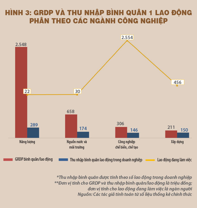 Có sự chênh lệch rất lớn về năng suất lao động và quy mô giữa các ngành công nghiệp (hình 3). Không tính ngoại lệ ngành dầu khí như đã nêu ở trên, dẫn đầu khu vực công nghiệp là ngành năng lượng, với GRDP bình quân khoảng 2,5 tỉ đồng/lao động, gấp 7 lần so với bình quân của thành phố. Kết quả này chủ yếu nhờ hệ thống điện khí và năng lượng tái tạo tại Bà Rịa - Vũng Tàu. Tuy nhiên, ngành này chỉ tạo ra khoảng 22.000 việc làm hay 0,3% tổng số việc làm toàn thành phố. Các ngành liên quan đến nguồn nước và môi trường xếp ở vị trí thứ hai, với năng suất khoảng 658 triệu đồng/lao động, và tạo ra khoảng 30.000 việc làm.