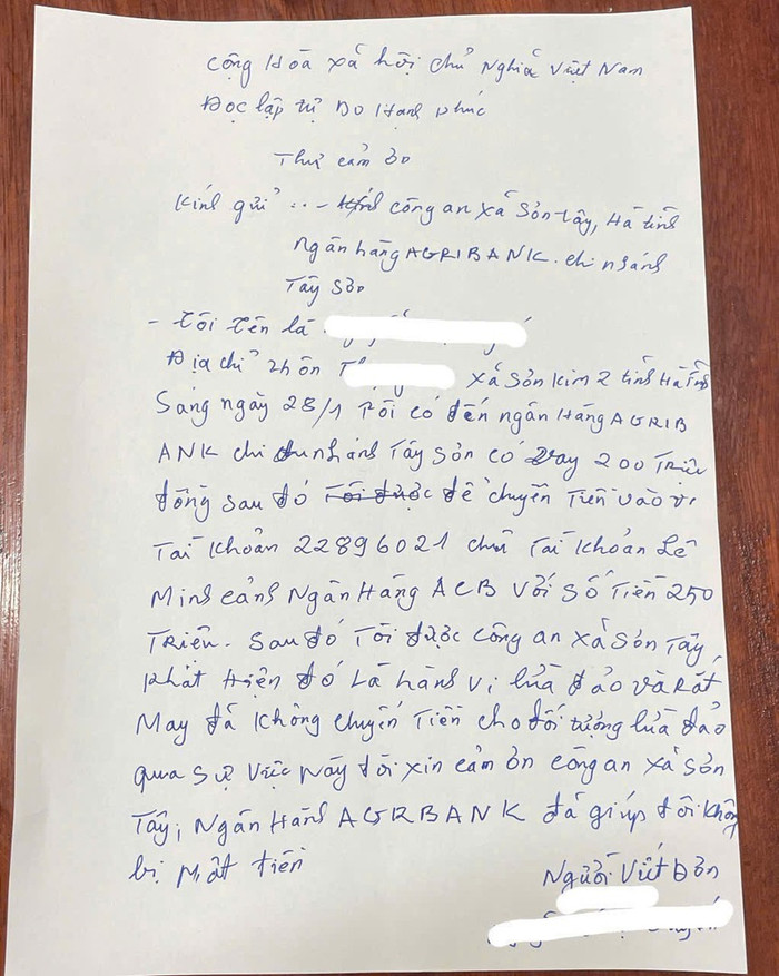 Bà N.T.T đã viết thư cảm ơn sự hỗ trợ kịp thời của các lực lượng chức năng giúp bà không bị lừa đảo.