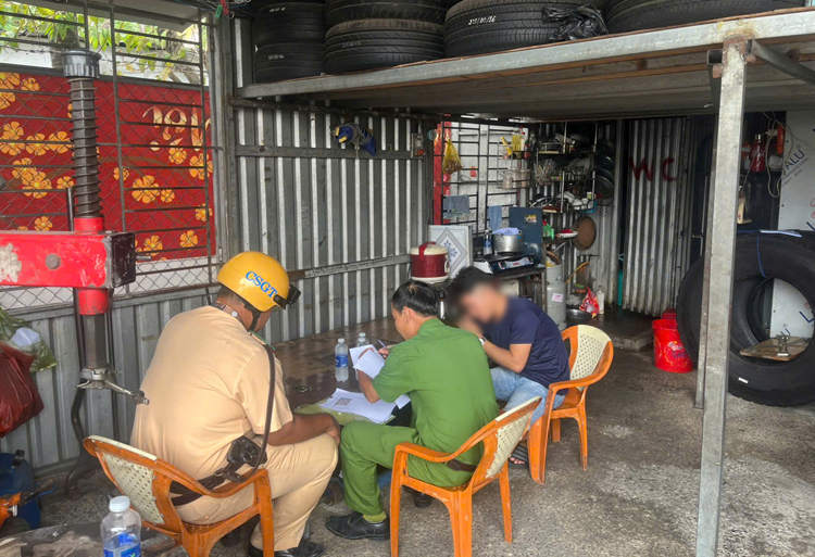 CSGT Đội CSGT An Sương phối hợp với Công an phường An Phú Đông tuyên truyền cho chủ cơ sở sửa chữa vá vỏ xe trên đường Đỗ Mười, phường An Phú Đông cam kết không tham gia hoạt động rải đinh... Ảnh: PC08