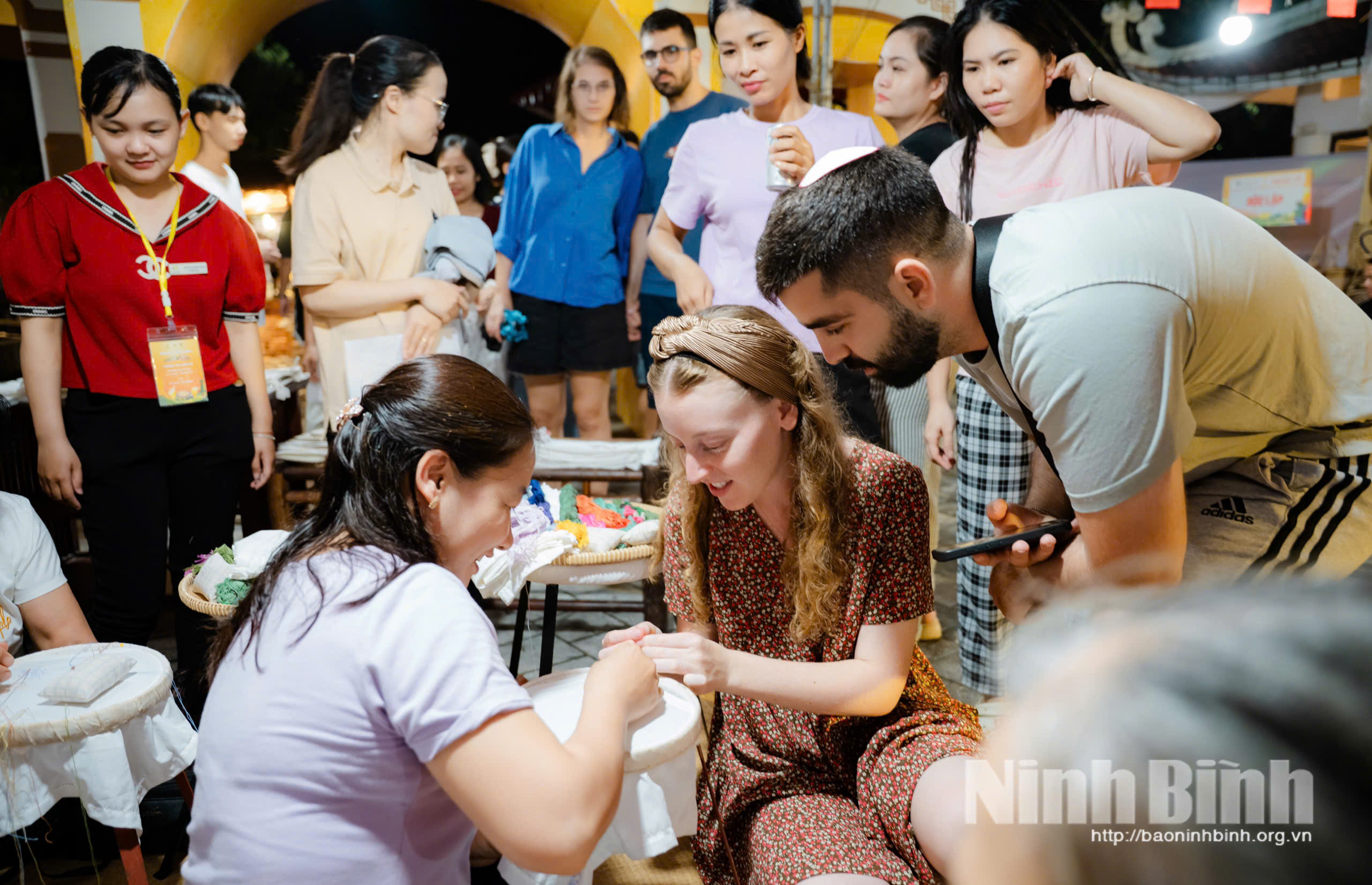 Du khách trải nghiệm nghề thêu ren Văn Lâm, phường Nam Hoa Lư vào buổi tối.