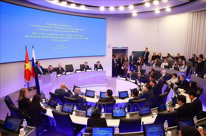 Thủ tướng Phạm Minh Chính với lãnh đạo và sinh viên Đại học Nghiên cứu Công nghệ Quốc gia MISIS. Ảnh: Dương Giang/TTXVN