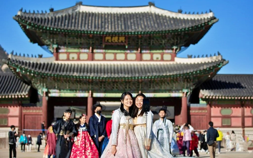 Khách du lịch mặc trang phục Hanbok truyền thống chụp ảnh tại Cung điện Gyeongbokgung ở Seoul, Hàn Quốc. Ảnh: Xinhua/Wang Yiliang